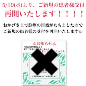 スタッフの交通事故に伴い、ご新規の患者様の受付を見合わせておりましたが、診療の目処がたちましたので受付を再開させていただきます!