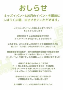これまでは、楽しみに来てくださる患者様のために、どうにか続けたい!との思いで中止をせずに行ってまいりましたが、緊急事態宣言の延長や市内の保育園・幼稚園での感染を受け、狭い空間でマスクをせずに密になってしまうキッズイベントを続けていくのは難しいという判断に至りました。。